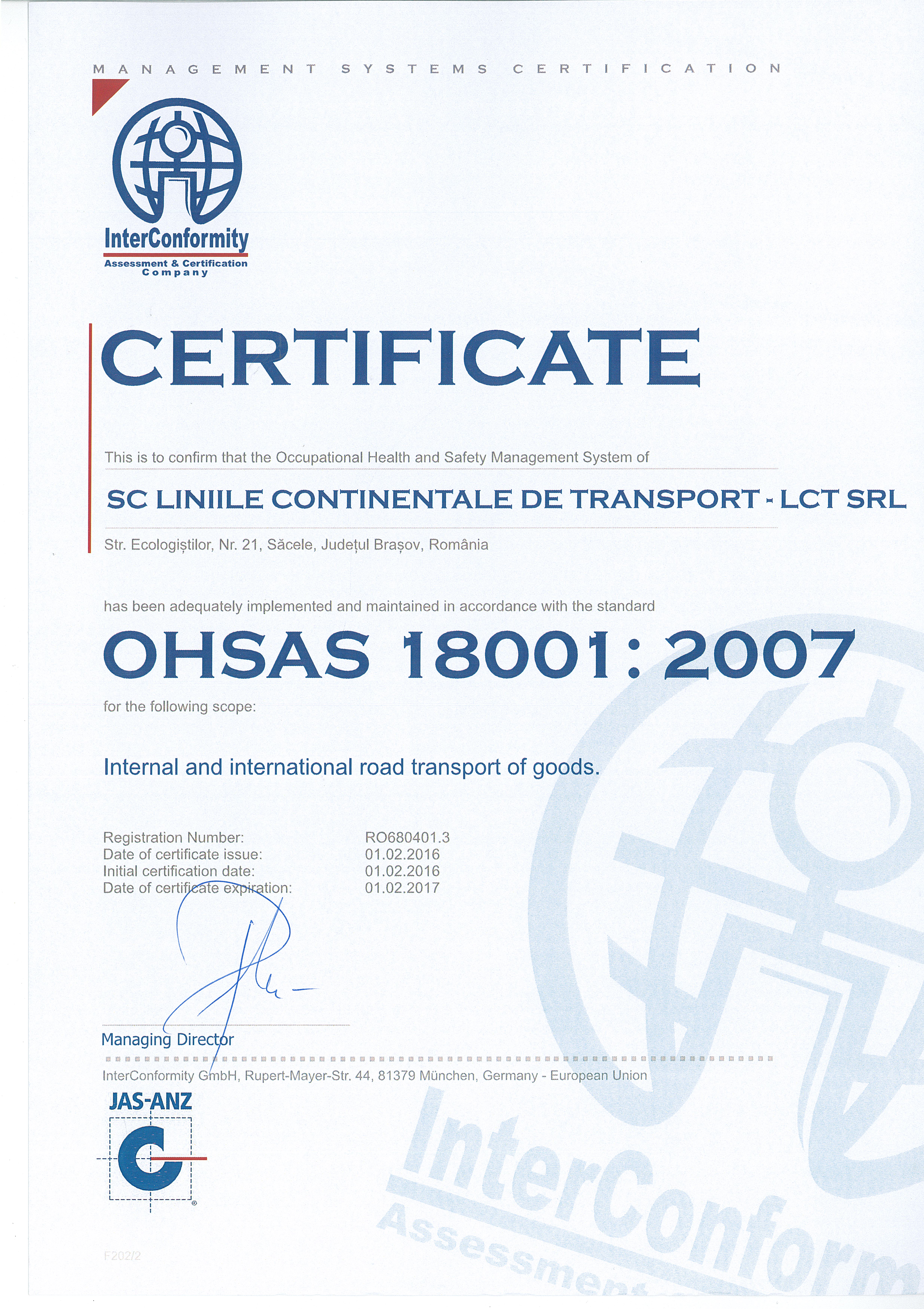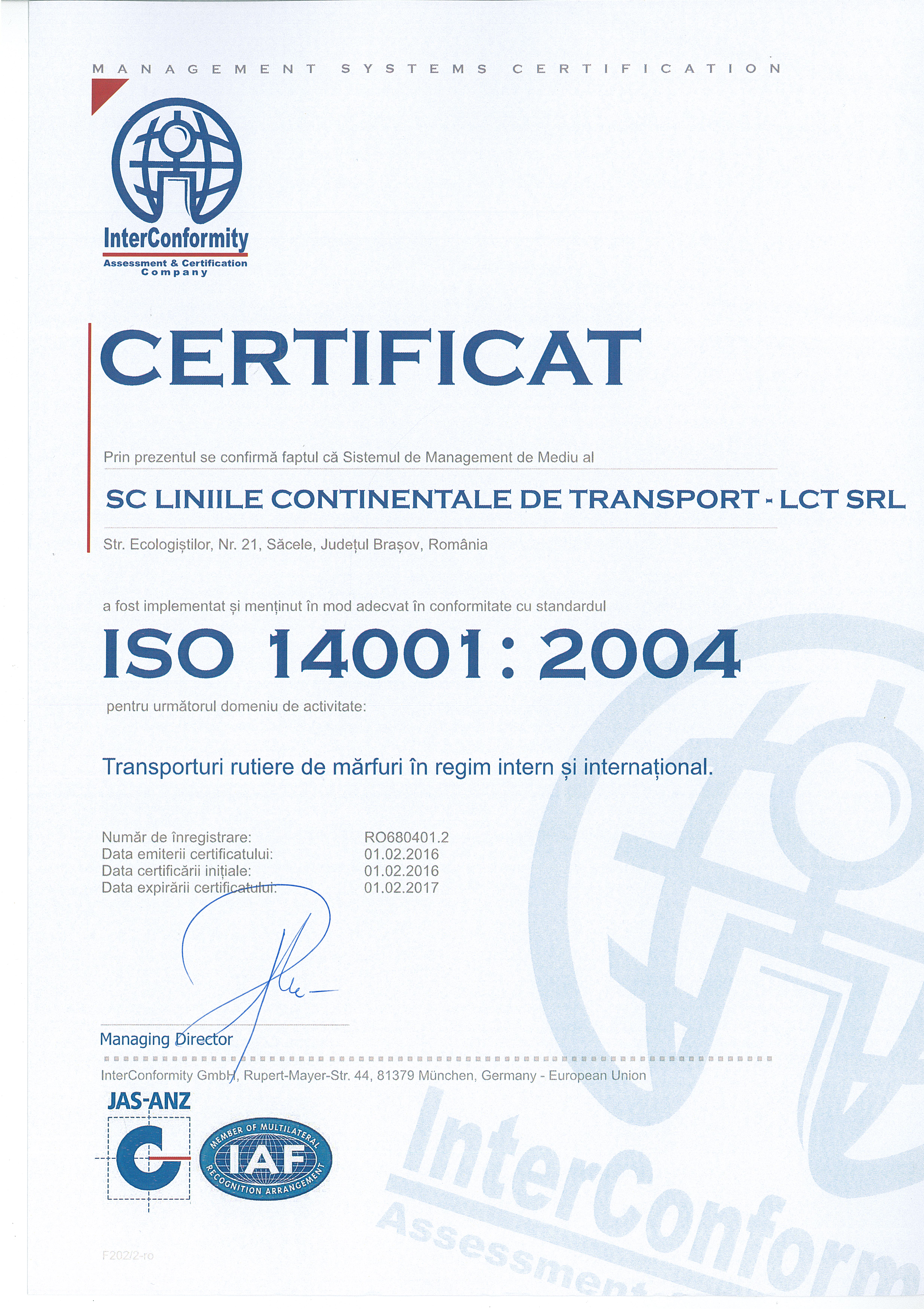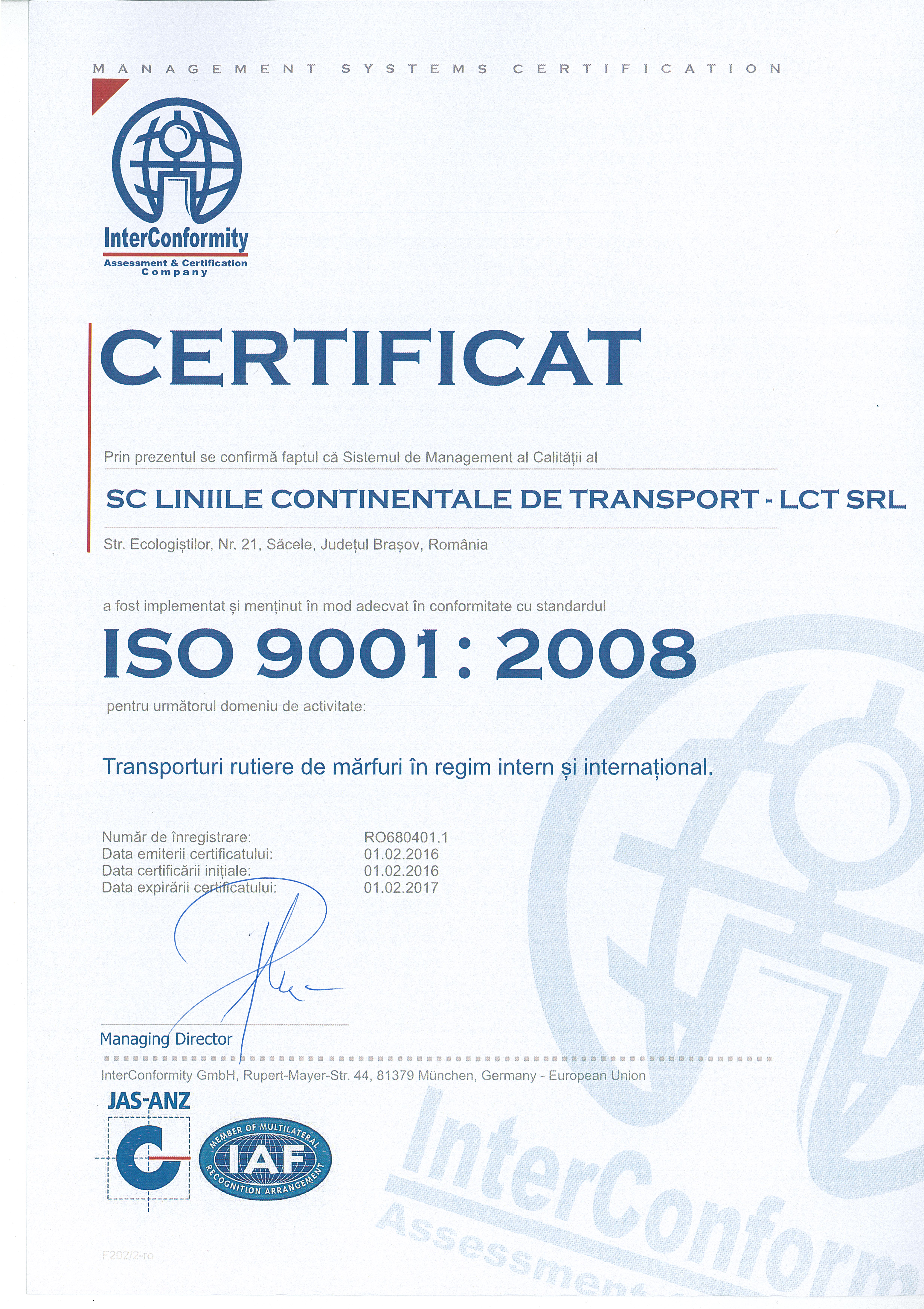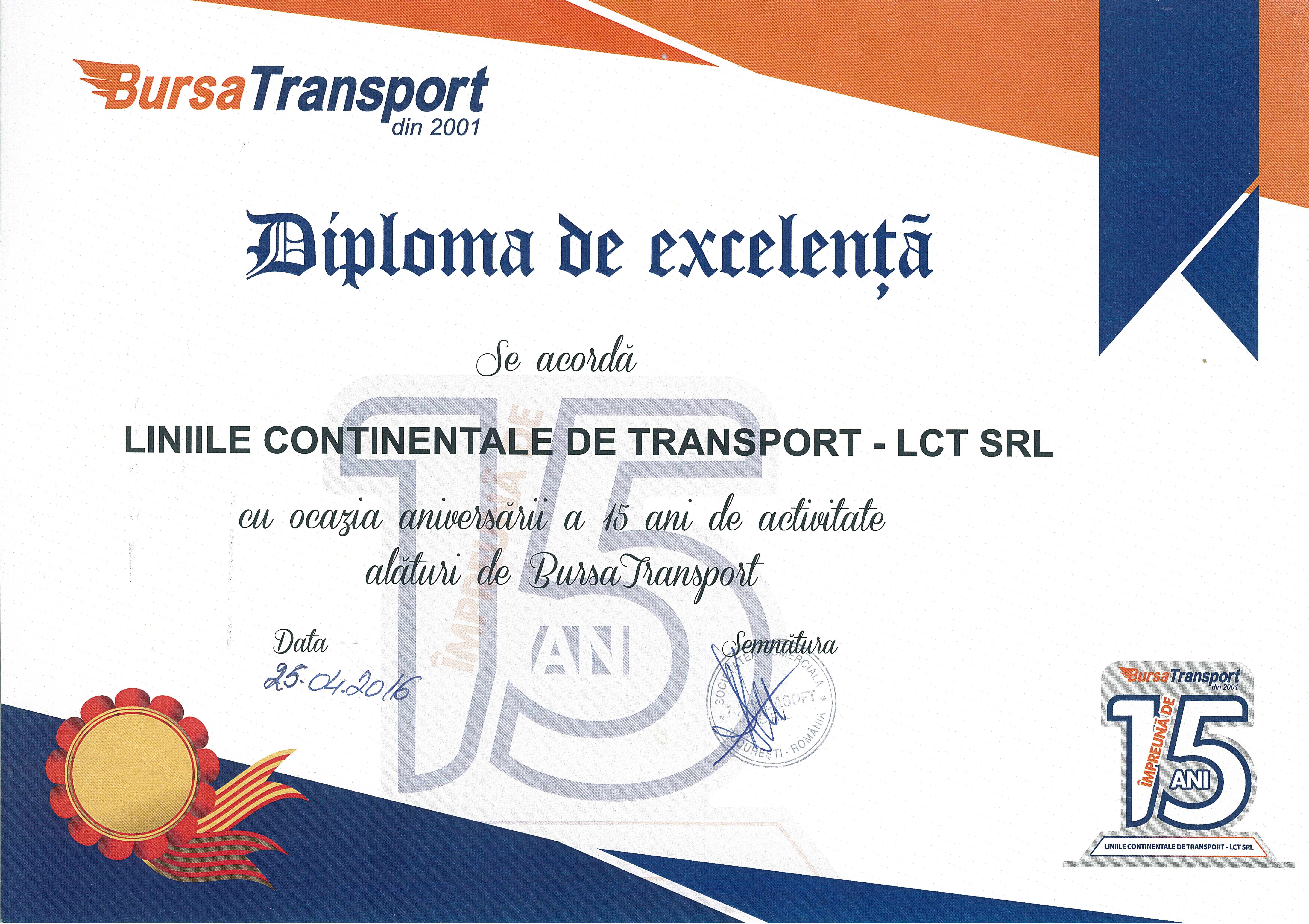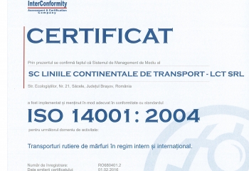 Citeste mai multCompania Liniile Continentale de Transport adica L.C.T. S.R.L este o societate comerciala romaneasca cu o vasta experienta in domeniul transportului de marfuri generale si ADR, activand pe intreg spatiul european. Mai mult de atat L.C.T. este o echipa de profesionisti din mai multe domenii precum finante, transport, resurse umane si IT, care muncesc cu drag in fiecare zi mentinand un standard constant al calitatii serviciilor noastre.